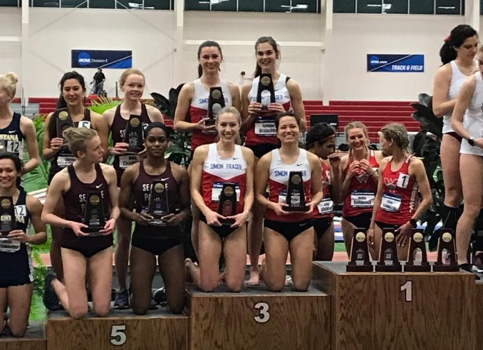 On Saturday, March 10, the SFU track and field team ended their indoor season at the National Collegiate Athletic Association (NCAA) Championships in Pittsburg, Kansas. The team performed admirably, with the third-place finish in the distance medley relay (DMR) by Miryam Basset, Renate Bluschke, Alana Mussatto, and Julia Howley undoubtedly being the highlight. Here’s how it went down: