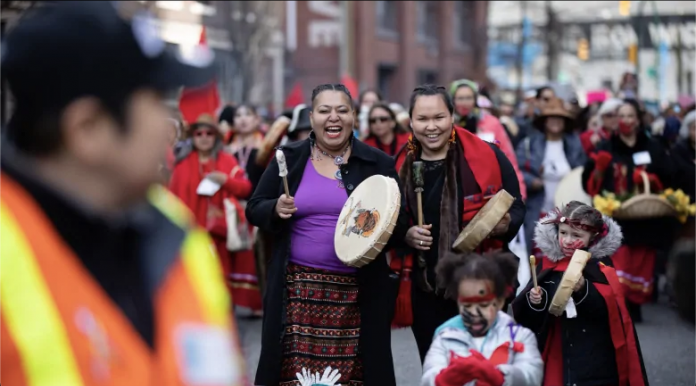 The Women’s Memorial March was started by Indigenous women in Vancouver’s Downtown Eastside (unceded Coast Salish territory) in 1992, and is held every Valentine’s Day to honour MMIWG affected by continuing injustice. The March seeks to bring attention to the disproportionate loss of Indigenous women from the Downtown Eastside.