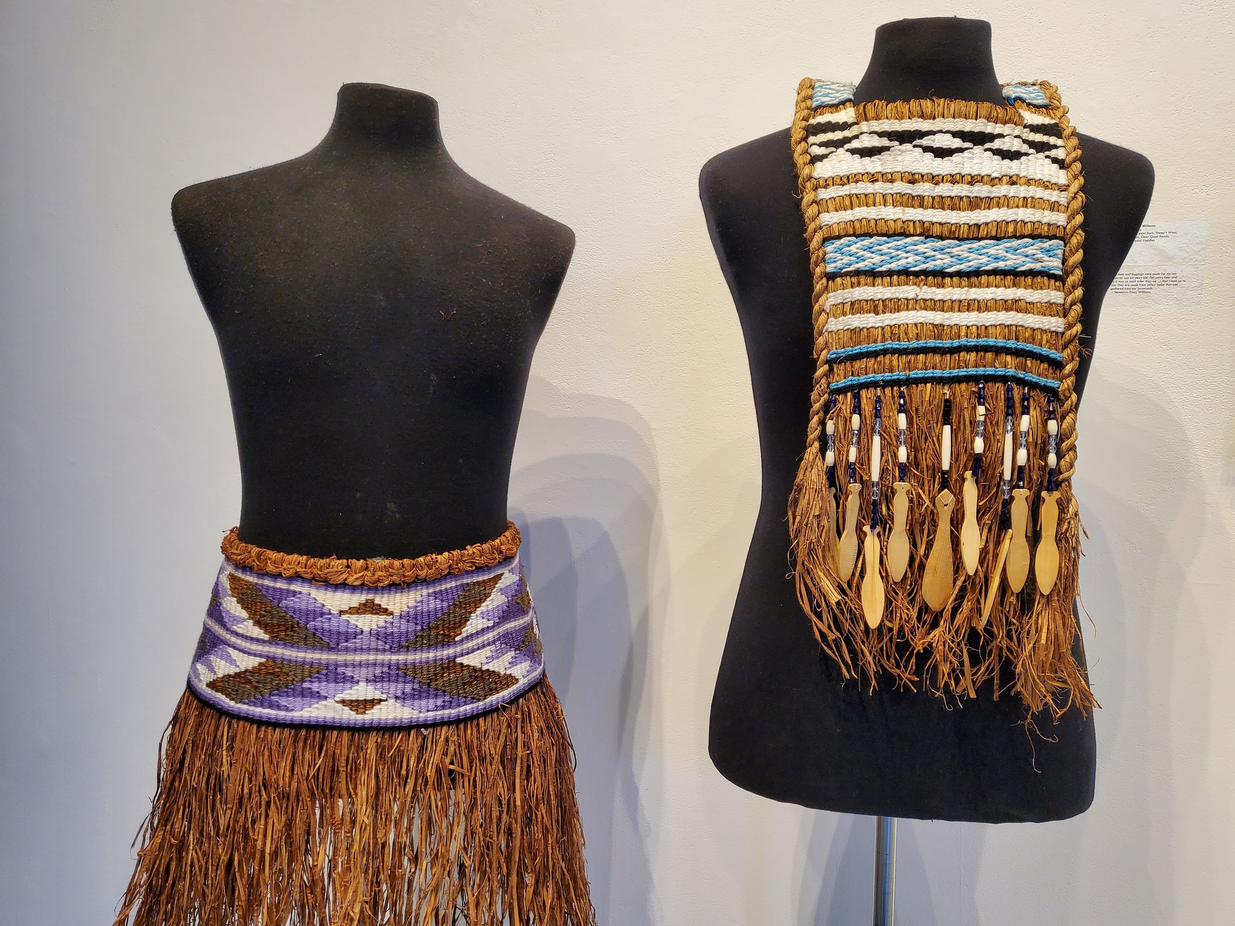 When visitors first enter the exhibit, they are greeted with objects Skwxwu7mesh artists made with cedar such as clappers (a musical instrument), bailers (used to scoop out water from canoes), and clothing.