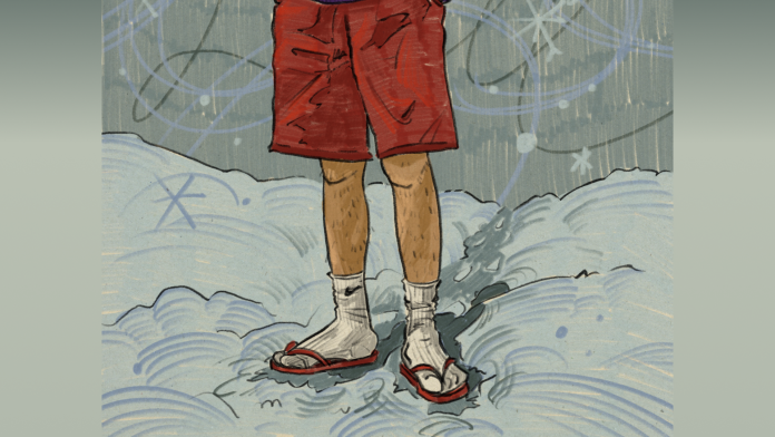 On a snowy mountain, about 366 metres above sea level, a fascinating creature can be found. We’ve staked out the Burnaby Mountain campus of SFU for hours, bearing the frosty winds and refilling our narrator’s hot chocolate so he can continue to do the deep knockoff David Attenborough voice. This extraordinary species stands out against the seasonal scenery. In all of his glory, there he is: that one guy who wears shorts during winter.