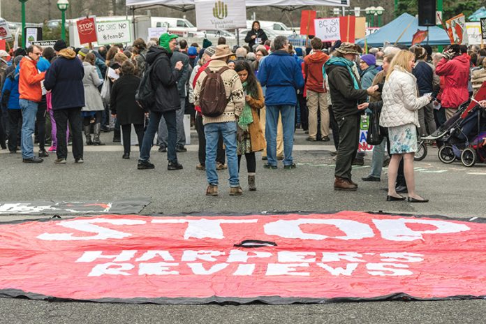 The protest on January 23, drew hundred of protestors who gathered outside the Delta Burnaby Hotel, where the hearings took place. - Photo by Kevin Rey